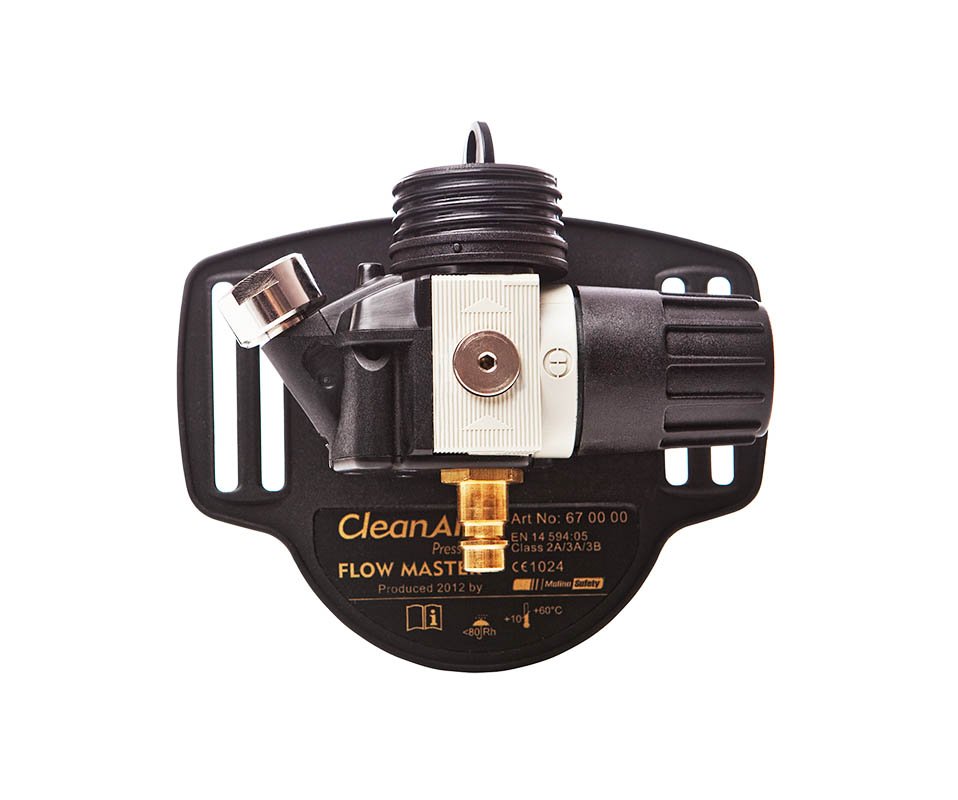 The CleanAIR Pressure Flow Master system provides a constant and dependable airflow to hoods and masks, making it suitable for long-term use in the most demanding industrial respiratory protection conditions. The belt-mounted regulator allows easy adjustment of air from a central compressed air source or compressor and maintains a steady airflow regardless of fluctuations in inlet pressure, ensuring consistent protection and comfort throughout the work shift with professional respiratory equipment.